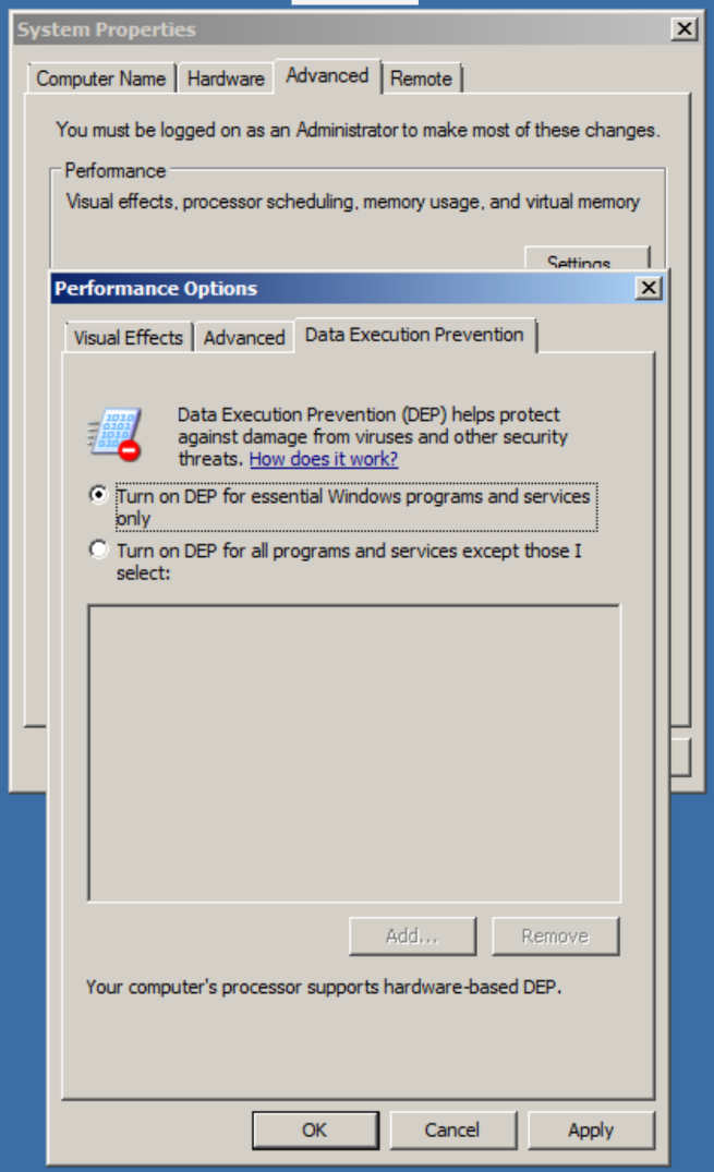 Another smaller window will appear, select the last tab titled "Data Execution Prevention" and select the first option "Turn on DEP for essential WIndows programs and services only" (see image below), click OK.